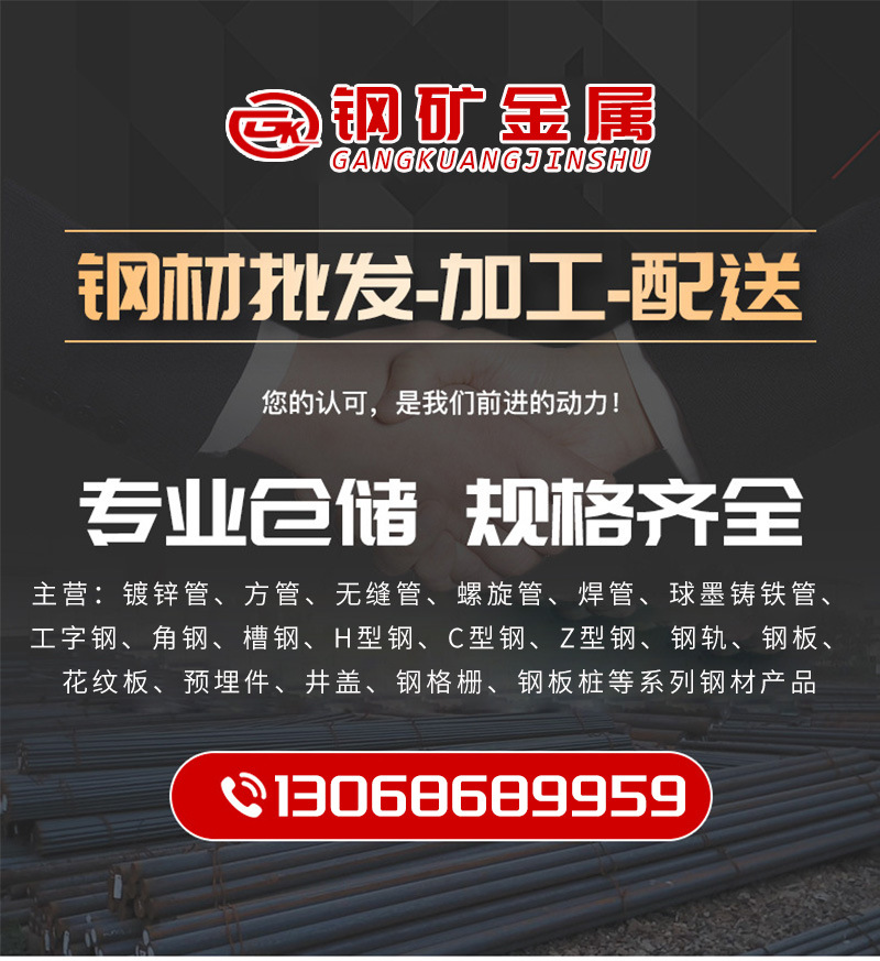 佛山钢矿金属有限公司是一家主要经营:镀锌管、方管、无缝管 、螺旋管、焊管、球墨铸铁管、工字钢、角钢、槽钢、H型钢、圆钢、扁铁、C型钢、Z型钢、钢轨、钢板、花纹板、预埋件、井盖、钢格栅、钢板桩等系列钢材产品 。