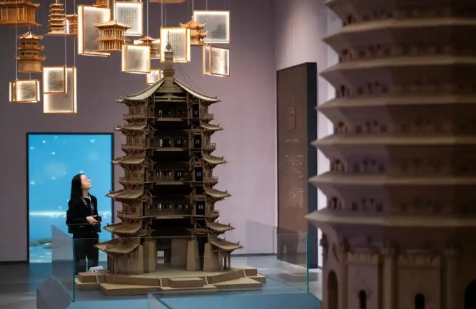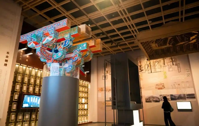 走进展厅,“牢而不固”的各式榫卯,“墙倒屋不塌”的抬梁式与穿斗式框架,兼具结构承重与装饰功能的层叠斗拱,穹顶上精美繁复的藻井等,令人目不暇接,展现出我国古建营造技艺的精妙。