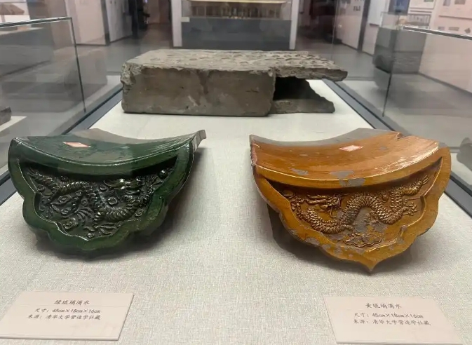 展览的中心位置,集中呈现了16件中国营造学社在古建调查中珍藏的样本,这也是这批样本首次走出清华大学、来到武汉展出。透过展柜可以看到,汉千秋万代印文砖纹路清晰,黄釉、绿釉琉璃滴水上的浅浮雕云龙纹姿态灵动,5件中国营造学社题写残片字迹可辨,无一不诉说着中国营造学社调查古建的足迹。