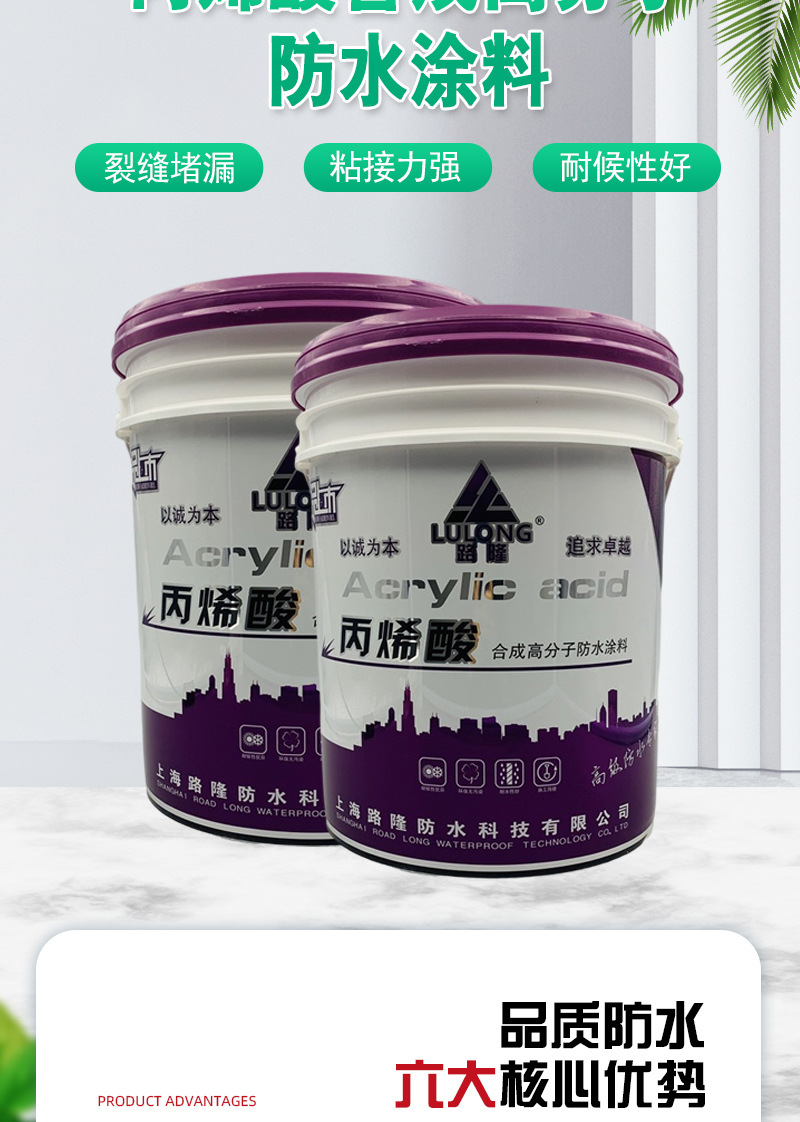 本网页所展示的有关【丙烯酸高分子防水涂料_防水涂料_上海路隆防水科技有限公司】的信息/图片/参数等由建筑云-建筑工程行业的专业平台的会员【上海路隆防水科技有限公司】提供,由建筑云-建筑工程行业的专业平台会员【上海路隆防水科技有限公司】自行对信息/图片/参数等的真实性、准确性和合法性负责,本平台(本网站)仅提供展示服务,请谨慎交易,因交易而产生的法律关系及法律纠纷由您自行协商解决,本平台(本网站)对此不承担任何责任。您在本网页可以浏览【丙烯酸高分子防水涂料_防水涂料_上海路隆防水科技有限公司】有关的信息/图片/价格等及提供【丙烯酸高分子防水涂料_防水涂料_上海路隆防水科技有限公司】的商家公司简介、联系方式等信息。