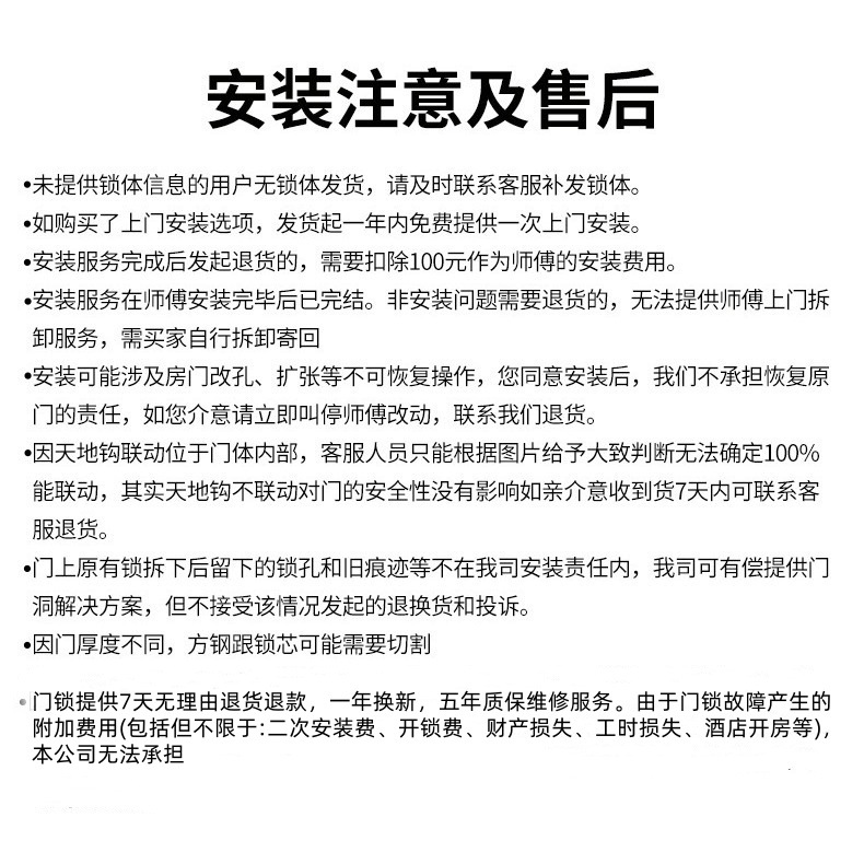 注意事项:1、由于非质量问题产生的费用,我司无法承担;2、请勿将机械钥匙留在室内,由于未携带机械钥匙导致的开锁费用等,我司无法承担;3、故障导致的额外费用(包括但不限于:二次安装费、开锁费、门或其他财产损失、工时损失、酒店开房等),因为这些费用和产品无直接相关,故我司无法承担,介意的亲慎拍。锂电池质保半年
