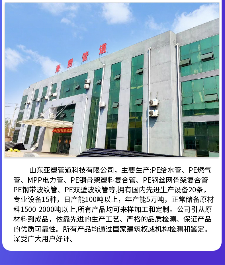 本网页所展示的有关【[亚塑管道pe管]给水灌溉消防穿线拖拉顶管pe水管自来水管 pe给水管_PE管材_山东亚塑管道科技有限公司】的信息/图片/参数等由建筑云-建筑工程行业的专业平台的会员【山东亚塑管道科技有限公司】提供,由建筑云-建筑工程行业的专业平台会员【山东亚塑管道科技有限公司】自行对信息/图片/参数等的真实性、准确性和合法性负责,本平台(本网站)仅提供展示服务,请谨慎交易,因交易而产生的法律关系及法律纠纷由您自行协商解决,本平台(本网站)对此不承担任何责任。您在本网页可以浏览【[亚塑管道pe管]给水灌溉消防穿线拖拉顶管pe水管自来水管 pe给水管_PE管材_山东亚塑管道科技有限公司】有关的信息/图片/价格等及提供【[亚塑管道pe管]给水灌溉消防穿线拖拉顶管pe水管自来水管 pe给水管_PE管材_山东亚塑管道科技有限公司】的商家公司简介、联系方式等信息。