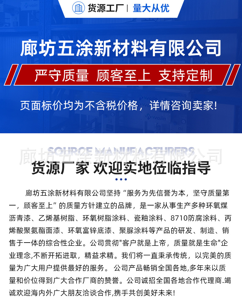 本网页所展示的有关【乙烯基树脂涂料三油两布水池防腐涂料阻燃frp增强玻璃钢树脂胶_油漆_廊坊五涂新材料有限公司】的信息/图片/参数等由建筑云-建筑工程行业的专业平台的会员【廊坊五涂新材料有限公司】提供,由建筑云-建筑工程行业的专业平台会员【廊坊五涂新材料有限公司】自行对信息/图片/参数等的真实性、准确性和合法性负责,本平台(本网站)仅提供展示服务,请谨慎交易,因交易而产生的法律关系及法律纠纷由您自行协商解决,本平台(本网站)对此不承担任何责任。您在本网页可以浏览【乙烯基树脂涂料三油两布水池防腐涂料阻燃frp增强玻璃钢树脂胶_油漆_廊坊五涂新材料有限公司】有关的信息/图片/价格等及提供【乙烯基树脂涂料三油两布水池防腐涂料阻燃frp增强玻璃钢树脂胶_油漆_廊坊五涂新材料有限公司】的商家公司简介、联系方式等信息。