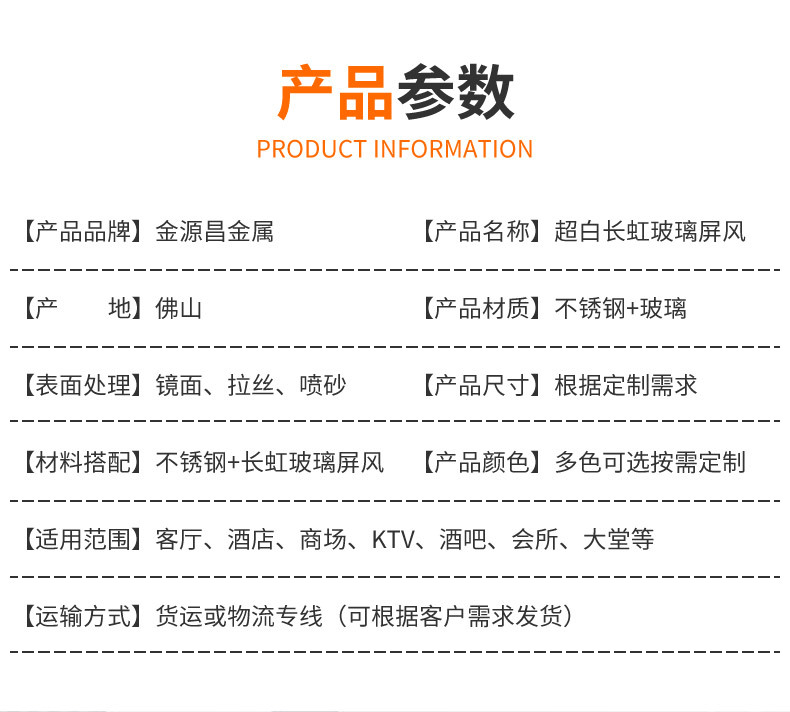 本网页所展示的有关【工厂铁艺不锈钢客厅办公室屏风隔断 玻璃简约装饰轻奢风金属隔断_隔墙隔断_佛山金源昌金属科技有限公司】的信息/图片/参数等由建筑云-建筑工程行业的专业平台的会员【佛山金源昌金属科技有限公司】提供,由建筑云-建筑工程行业的专业平台会员【佛山金源昌金属科技有限公司】自行对信息/图片/参数等的真实性、准确性和合法性负责,本平台(本网站)仅提供展示服务,请谨慎交易,因交易而产生的法律关系及法律纠纷由您自行协商解决,本平台(本网站)对此不承担任何责任。您在本网页可以浏览【工厂铁艺不锈钢客厅办公室屏风隔断 玻璃简约装饰轻奢风金属隔断_隔墙隔断_佛山金源昌金属科技有限公司】有关的信息/图片/价格等及提供【工厂铁艺不锈钢客厅办公室屏风隔断 玻璃简约装饰轻奢风金属隔断_隔墙隔断_佛山金源昌金属科技有限公司】的商家公司简介、联系方式等信息。